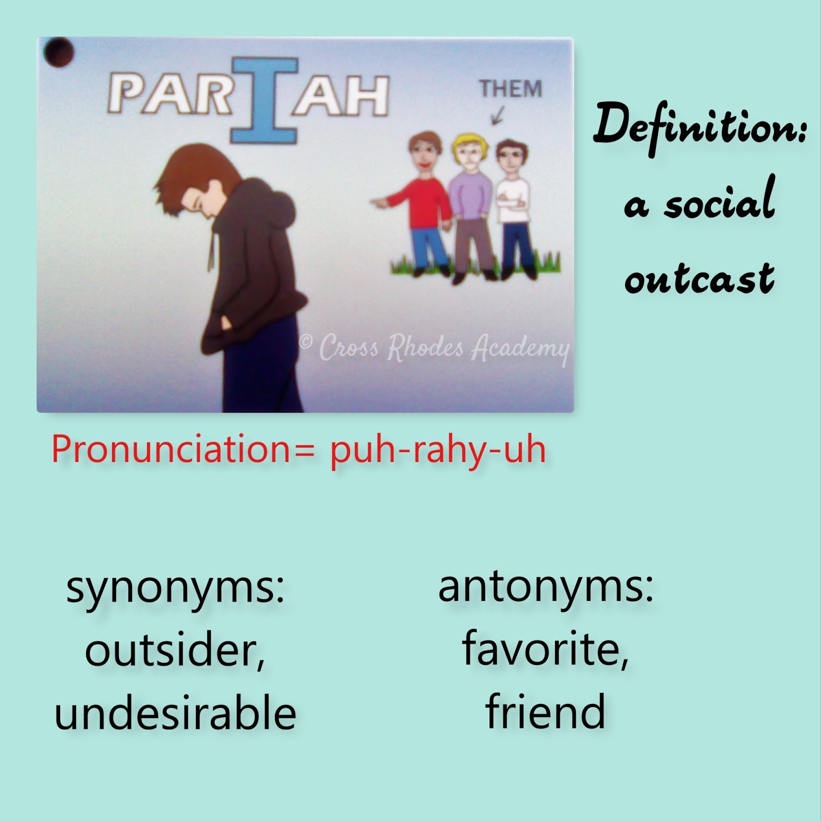 Pariah Synonym And Antonym : (pɝˈaɪə) a person who is rejected (from society or home). Pariah Synonym And Antonym - One who is cast out or rejected by society.